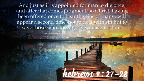 Hebrews 9:27-28 “And just as it is appointed for man to die once, and after that comes judgment, so Christ, having been offered once to bear the sins of many, will appear a second time, not to deal with sin but to save those who are eagerly waiting for him.”