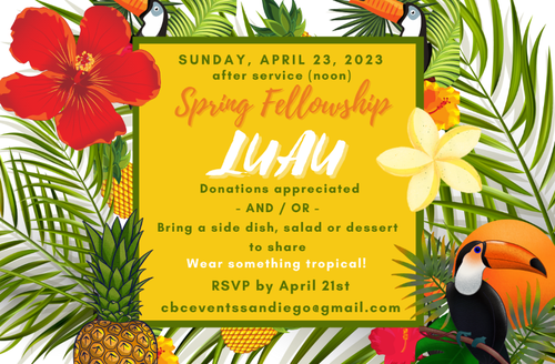 For the past few weekends we've been announcing the Spring Fellowship Luau. It's this Sunday after service. This will be a great time to connect with the church family. Feel free to invite a friend. The church will be providing pulled pork. We simply ask you to RSVP by Friday morning. If you have questions, or want to sign up, please email our CBC Event Coordinator, Cris Olsen, at: cbceventssandiego@gmail.com