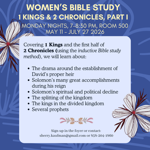 Join us on Monday nights, beginning May 11 as our Women’s Bible Study begins Part 1 of our study, 1-2 Kings and 2 Chronicles. This 12-week study will focus on the books of 1 Kings and 2 Chronicles.