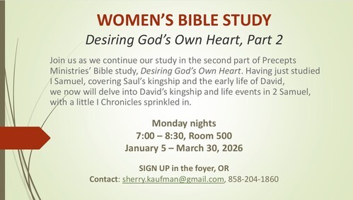 Join us on Monday nights, beginning January 5 as our Women’s Bible Study begins Part 2 of our study, Desiring God’s Own Heart. This 13-week study will focus on the books of II Samuel and I Chronicles.
