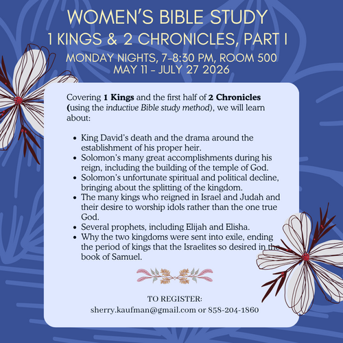 Join us on Monday nights, beginning May 11 as our Women’s Bible Study begins Part 1 of our study, 1-2 Kings and 2 Chronicles. This 12-week study will focus on the books of 1 Kings and 2 Chronicles.